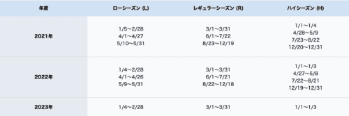Lがローシーズン、Rがレギュラーシーズン、Hはハイシーズンを表しています。L→R→Hの順に必要マイル数は増えて行きます。また、搭乗クラスはYがエコノミークラス、PYがプレミアムエコノミークラス、Cがビジネスクラス、Fがファーストクラスとなっています。