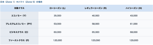 まずはハワイの特典航空券の交換に必要なマイル数を確認していきます。特典航空券に必要なマイル数はシーズン、クラスによって異なります。まずは日本⇄ハワイに行く際に必要なマイル数を確認します。