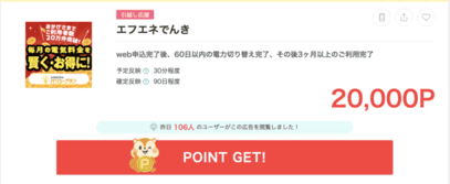 例えば、エフエネでんきの場合、電気切り替え契約後、3ヶ月の利用で20,000ポイント獲得できます。