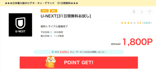 動画配信サービスサイトのU-NEXTの1ヶ月無料体験に申し込みをするだけで1,800ptも獲得可能です。