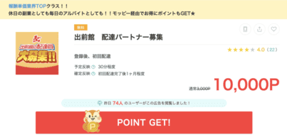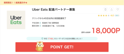 フードデリバリー案件も比較的楽に稼げる案件の一つ。 フードデリバリーのドライバーとしてサイトに登録し、初回配達を達成するだけで高額のポイントを獲得できるようなシステムになっています。