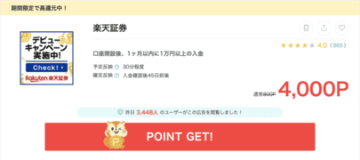 例えば、楽天証券の場合、口座開設後、1ヶ月以内に1万円の入金で4,000pt獲得。