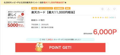 例えば、クレジットカードの王道である「楽天カード」はカード発行のみで6,000pt獲得可能。