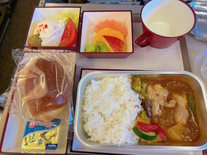 1年前(2024年)に搭乗した際はチキンカレーにフルーツ、ポテトサラダなど小鉢も充実していましたが、2026年現在はコスト削減の影響か、見劣りするお菓子などで量を嵩増ししている印象。