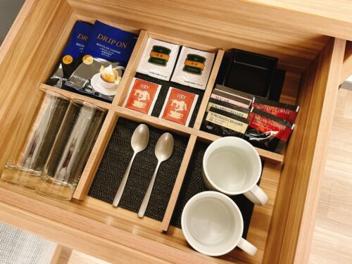 ミニバーの引き出しを開けると、無料でいただけるティーバッグやドリップ式のコーヒーパックが収納されています。