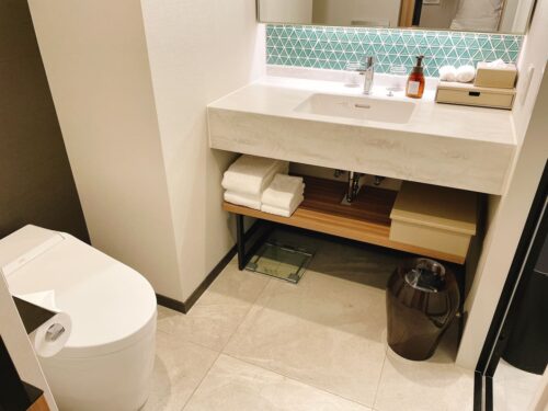 パウダーエリアは一つのエリアに洗面台、トイレ、シャワールームがまとまって配置されている設計。