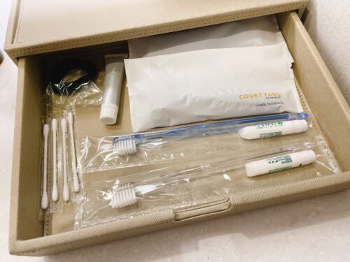 基礎化粧品セットを忘れた場合、ホテルへリクエストすれば、洗顔・化粧水・乳液のセットをいただけますよ。