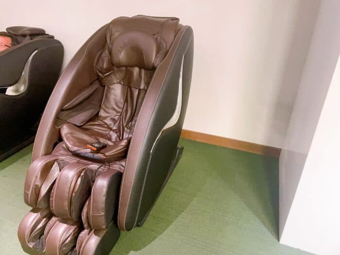 奥のエリアにはマッサージチェアも2台用意されており、長時間のフライト前に体をほぐしてリラックスできます。