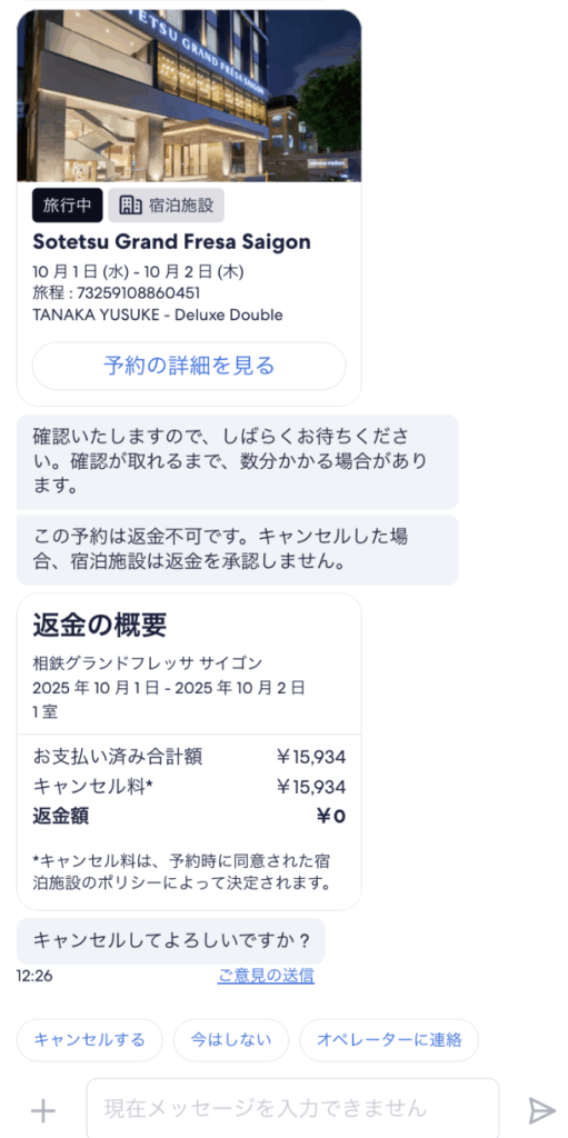 「返金不可」と表示されている予約では、キャンセル料がかかり、その金額が画面に表示されます。