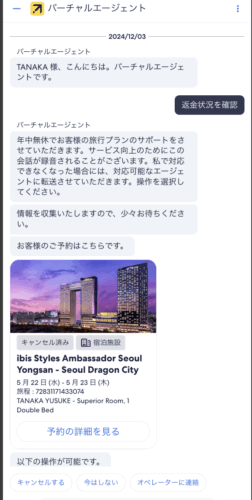 エクスペディアアプリには、予約の変更やキャンセルをサポートするバーチャルエージェント機能があります。