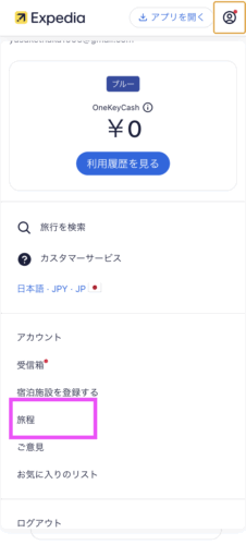 エクスペディアアプリを開き、ログイン後に右上にある人間のアイコンをタップします。