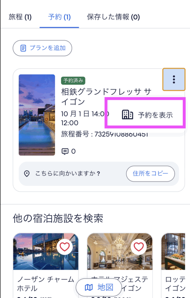 すると、過去に滞在したホテルの詳細が出現するのでホテル名の右横にある3本の点をタップ。