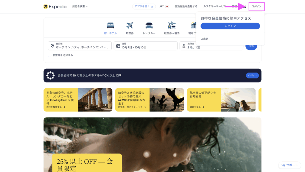 ログインするには、まずエクスペディアの公式サイトにアクセスします。
