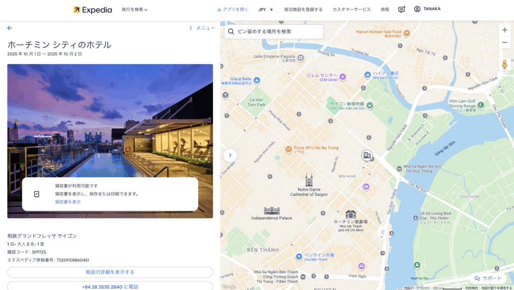 また、エクスペディアの領収書には、宿泊施設名、宿泊日程、客室料金から宛名などが記載されます。