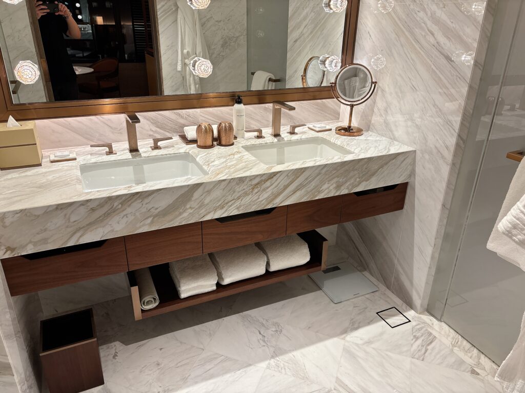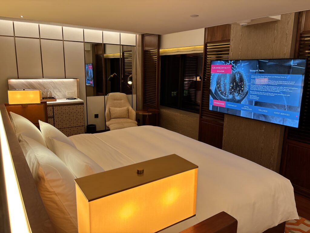 お部屋はグランドハイアットらしいダークブラウンを基調とした客室で居心地が良く、水回りも非常に清潔で高級感がありました。