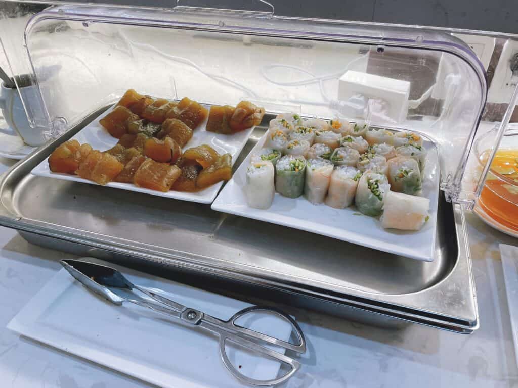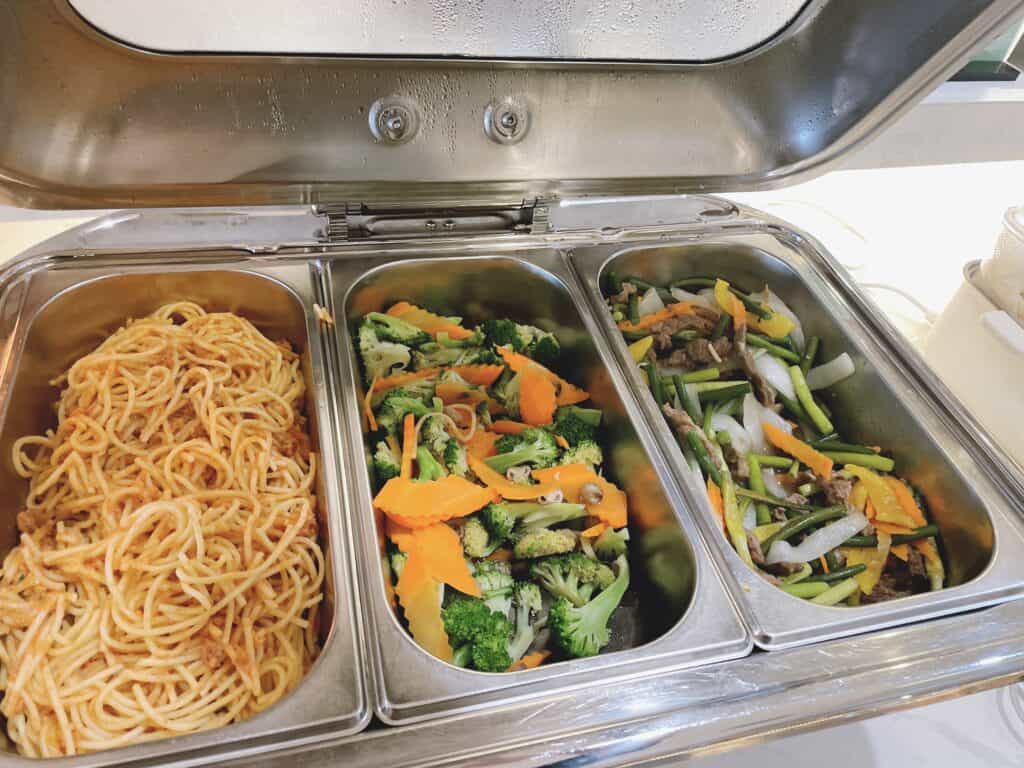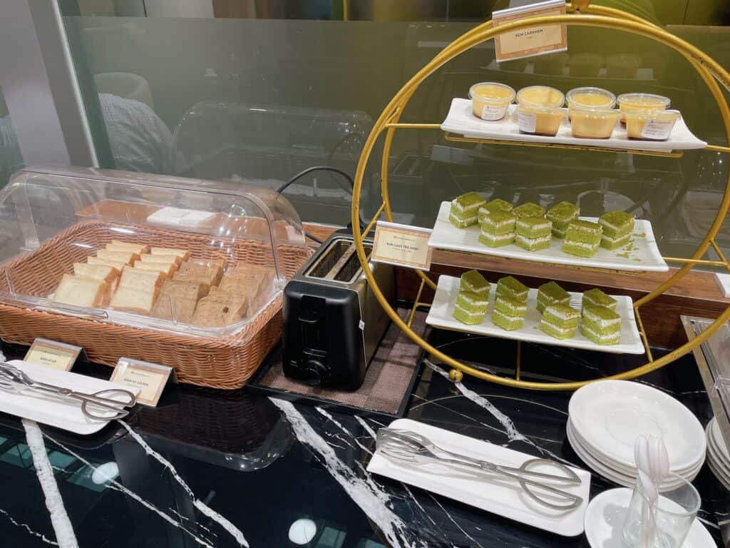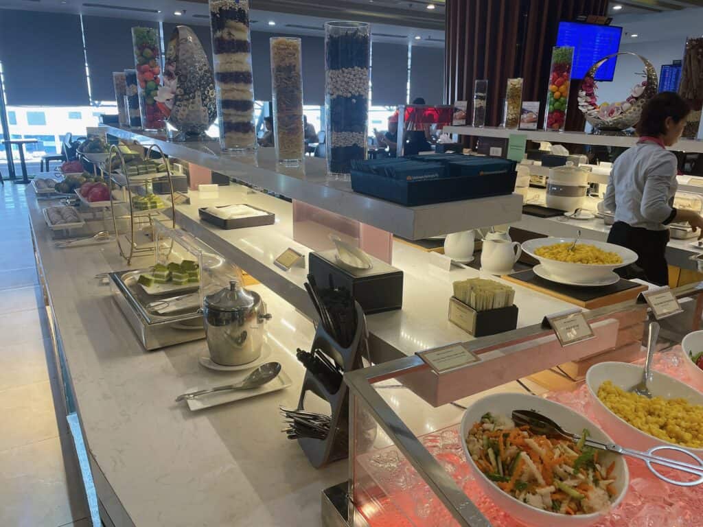 ラウンジ内にはビュッフェ台が用意されており、数十種類の軽食を楽しめます。