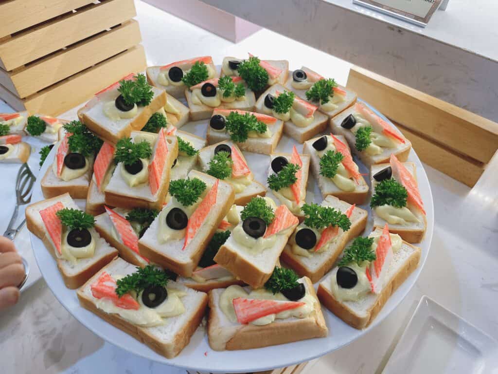トーストの上にチーズ・かにかま・オリーブをのせたやつ。