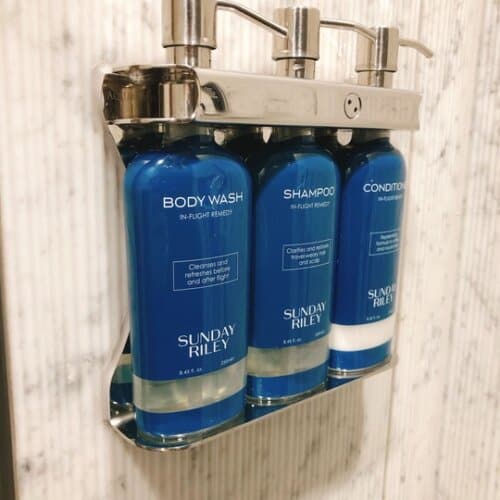 シャンプーやシャワージェルはポンプ式で、アメリカのスキンケアブランド、SUNDAY RILEY(サンデーライリー)が置かれています。アメリカのセレブに話題沸騰中のブランドらしいです。植物由来の成分を利用していて、お肌に優しいとのこと。