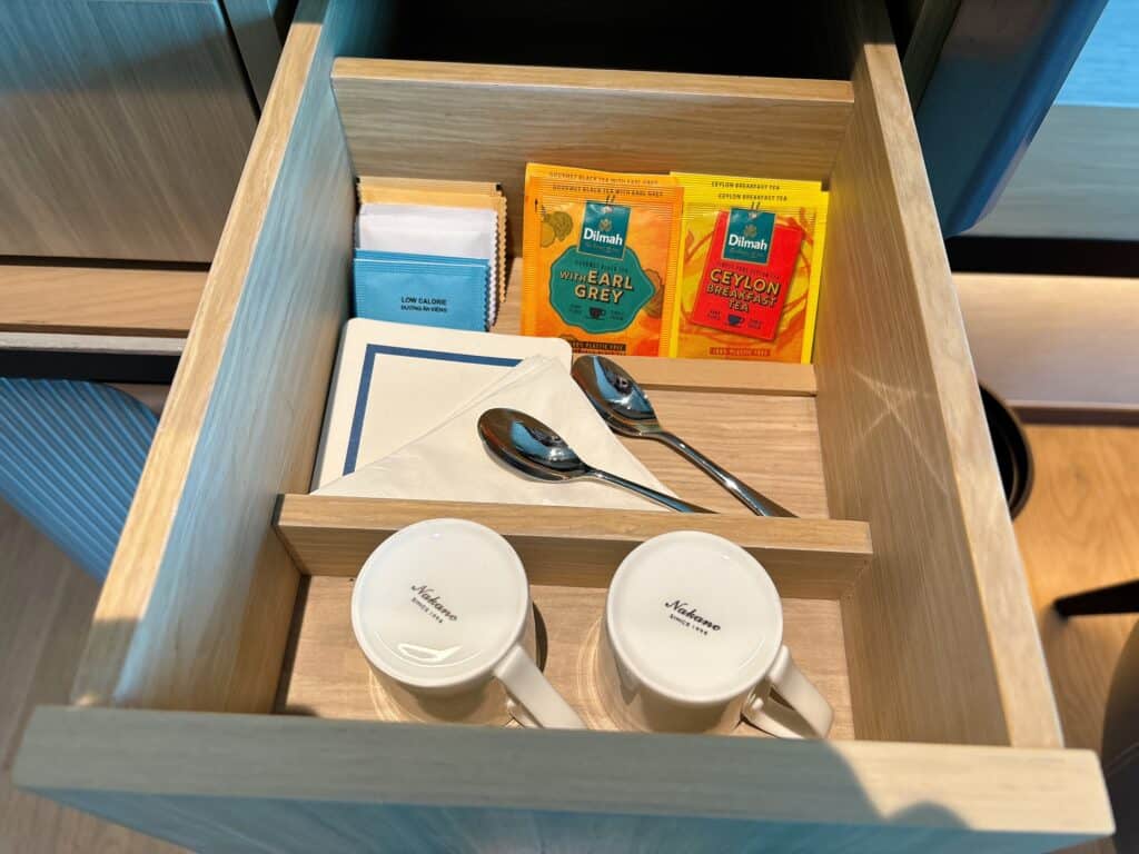 引き出しを開けると、ティーバッグがコーヒーカップなどが収納されていました。