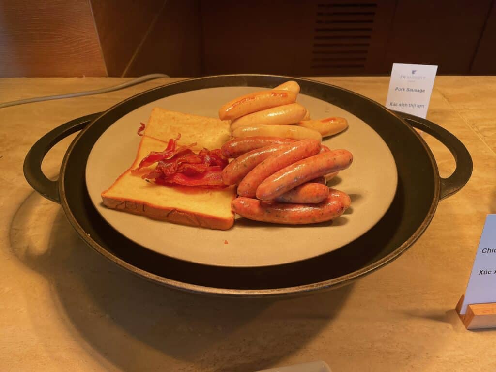 ホットミールコーナーにはホテル朝食の定番、ソーセージやカリカリベーコンといったイングリッシュブレックファーストメニューが並びます。