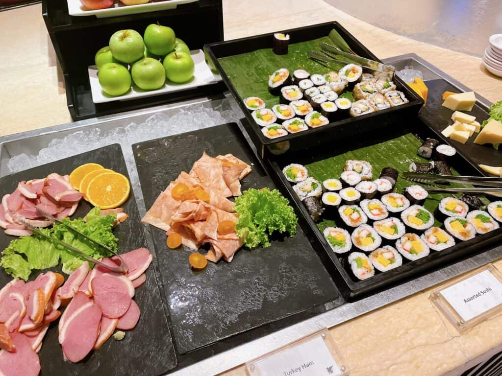 ハムや鴨ロースト、チーズ、寿司の用意があります。