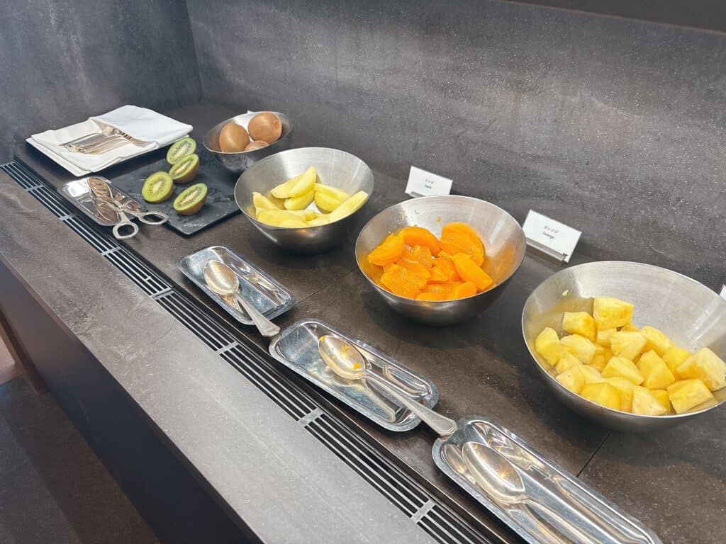フルーツコーナーにはパイナップル、オレンジ、キウイなど朝食の定番フルーツが並びます。
