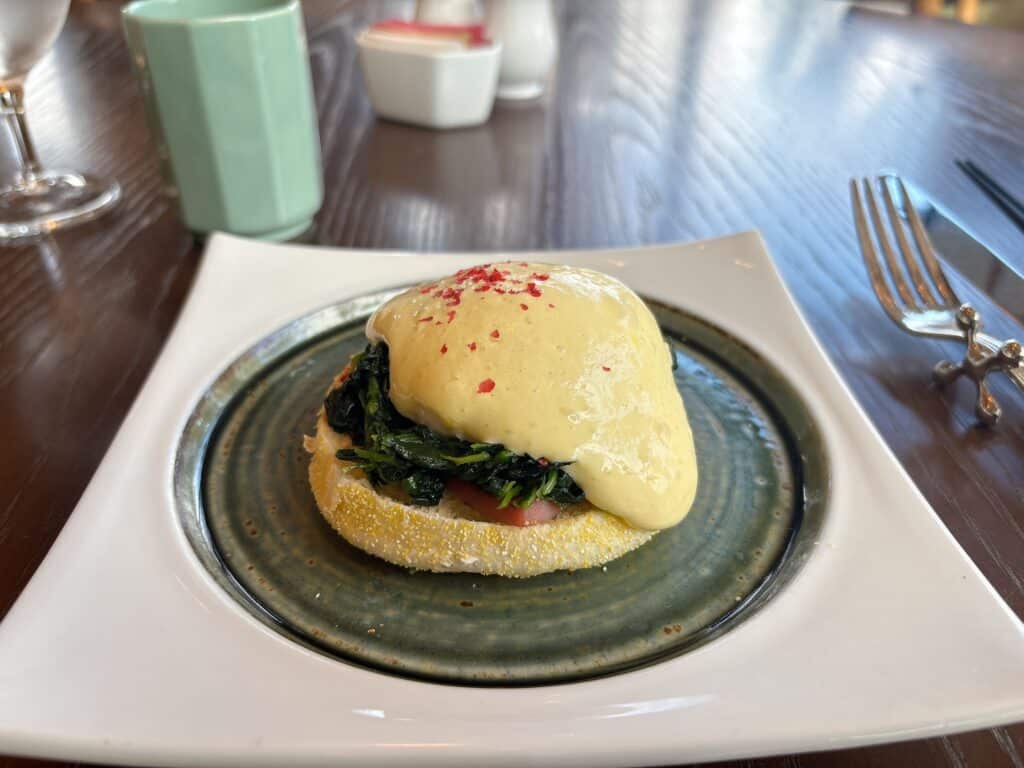 濃厚なオランデソースのしたにポーチドエッグ、ほうれん草。厚切りベーコンはある王道スタイル。