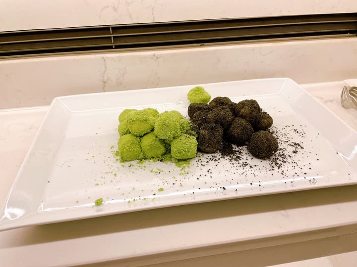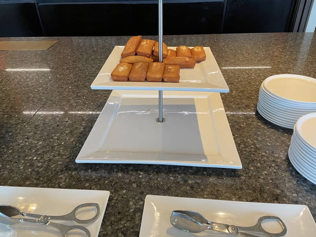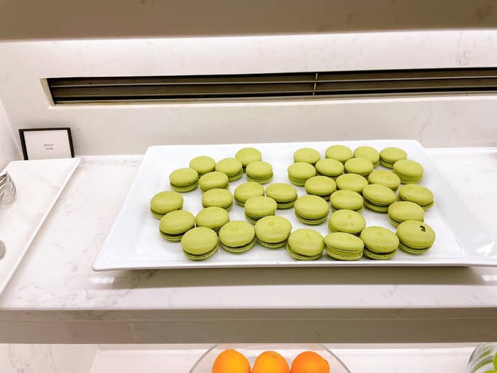 デザートコーナーには、マカロン、お団子、パウンドケーキ、キウイやチェリーなどのフルーツなどが提供されていました。
