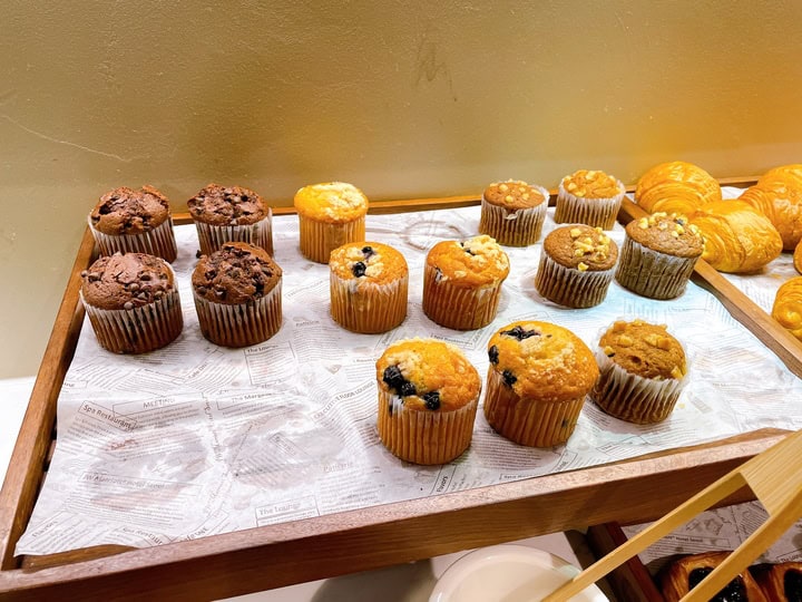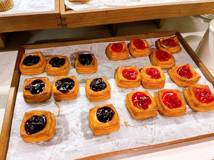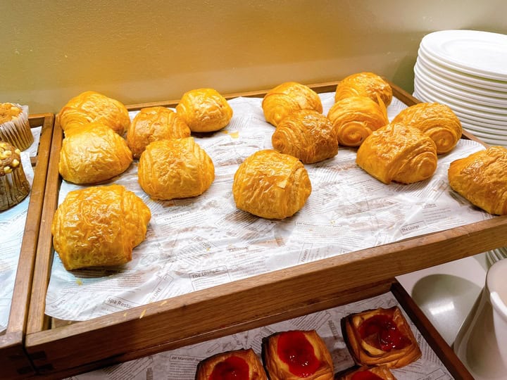 パンコーナーには、クロワッサン、デニッシュ系のパン、シリアルなどが並んでています。