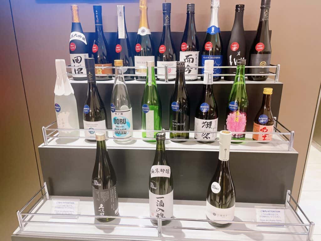 ラウンジ内では、ビジネスクラス・ファーストクラスで提供される日本酒の瓶が飾られています。
