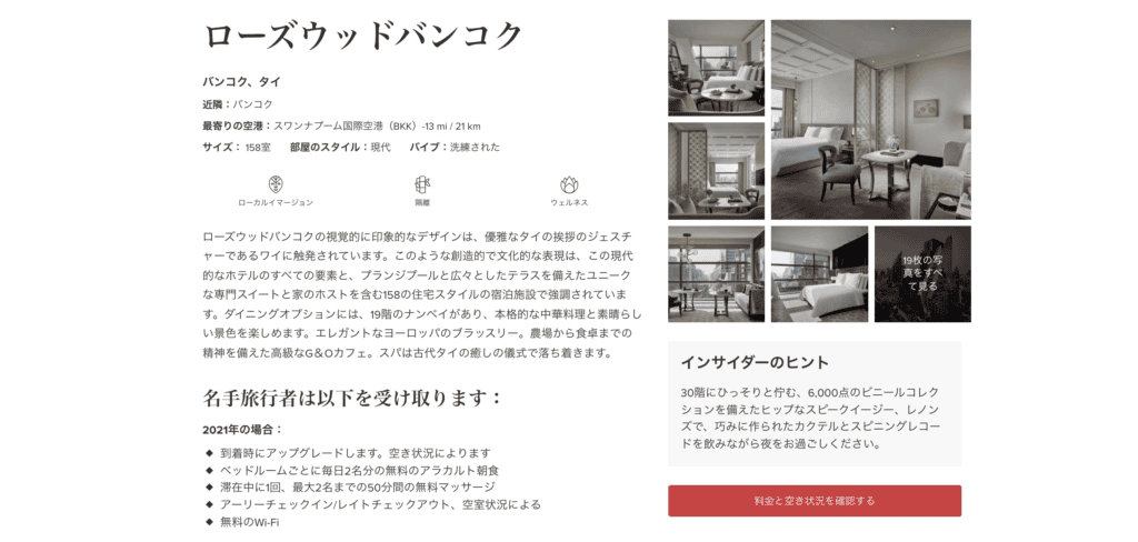 例えば、バンコクの最高級ホテルとして有名な「ローズウッドバンコク」の特典は上記の通りです。お部屋のアップグレードや朝食の無料特典に加えて、ホテルスパでの50分間の無料マッサージが最大2名分まで特典として付帯されます。