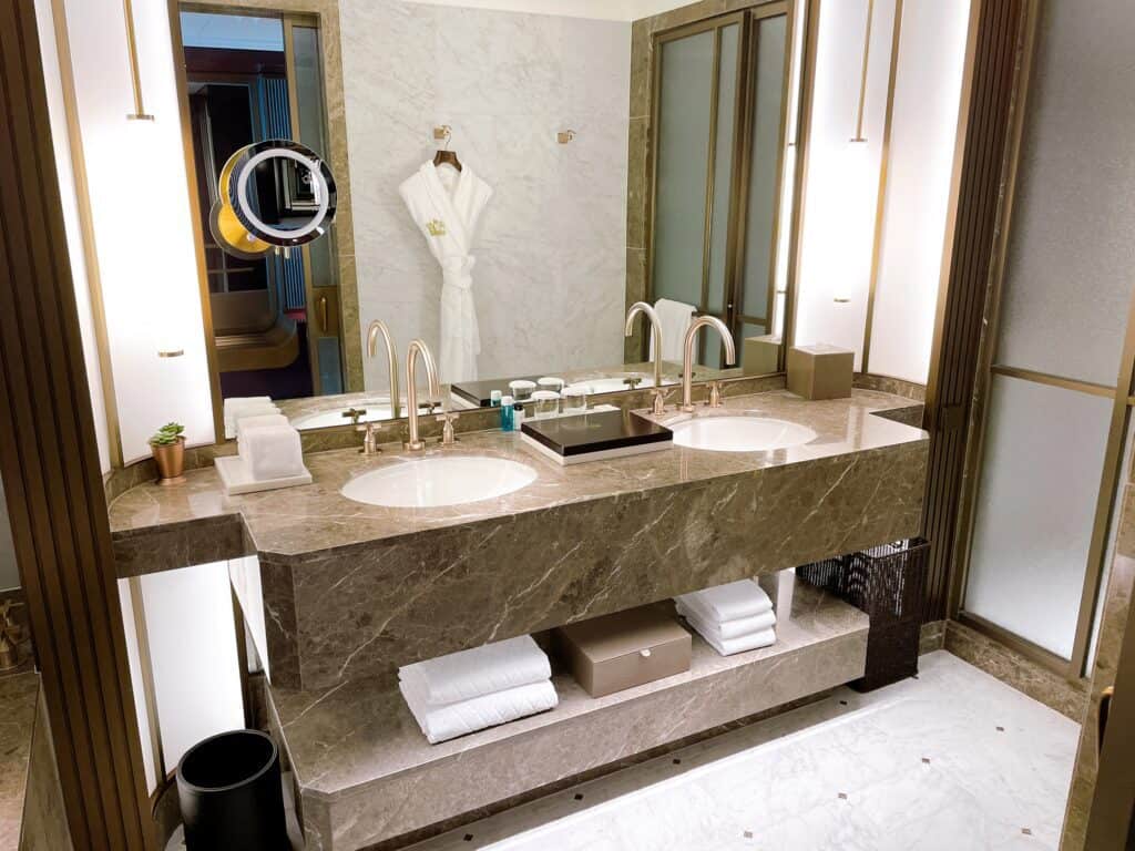 バスルームは大理石をふんだんに利用したラグジュアリーな空間になっており、一部客室では窓に面したビューバスを楽しめます。