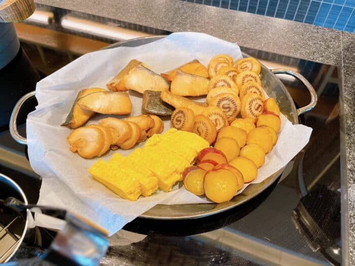 卵焼き、さつま芋のかんろ煮、シェラトンロゴが焼印されたさつま揚げ、焼き魚はカンパチの照り焼きでした。
