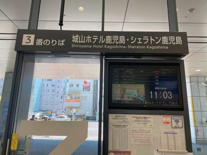 鹿児島空港から空港シャトルバスで鹿児島中央駅のバスターミナルに到着すると、同じフロアにシェラトン鹿児島行きのバス乗り場があるのでスムーズにホテルへ向かえますよ。