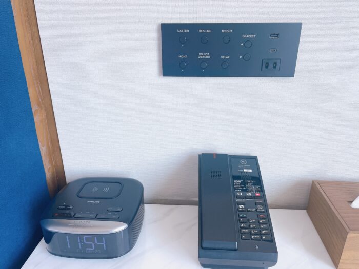 ベッドサイドには各種電源ボタン、スマホを置くだけで充電できるスピーカー付き目覚まし時計などがあります。