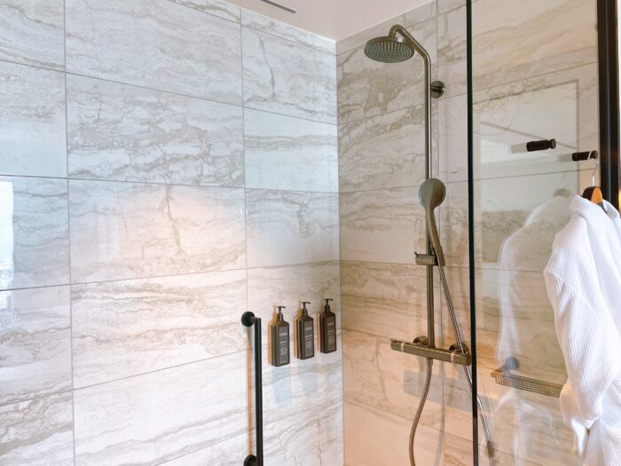 グレーっぽいカラーリングシャワーと大理石の空間が高級感を感じられます。