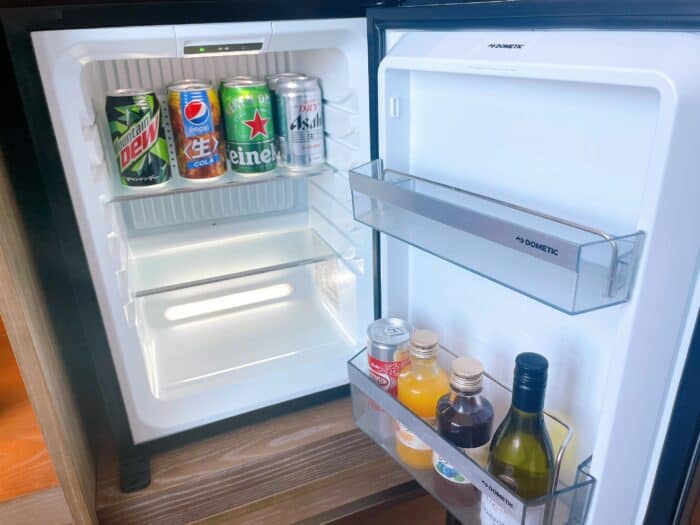 ミニバーの扉にはちょっとしたスナック菓子とワイングラス類が収納されています。