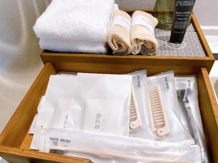 歯ブラシやコームといった基本的なアメニティに加えて、雪肌精の基礎化粧品セットが用意されていました。