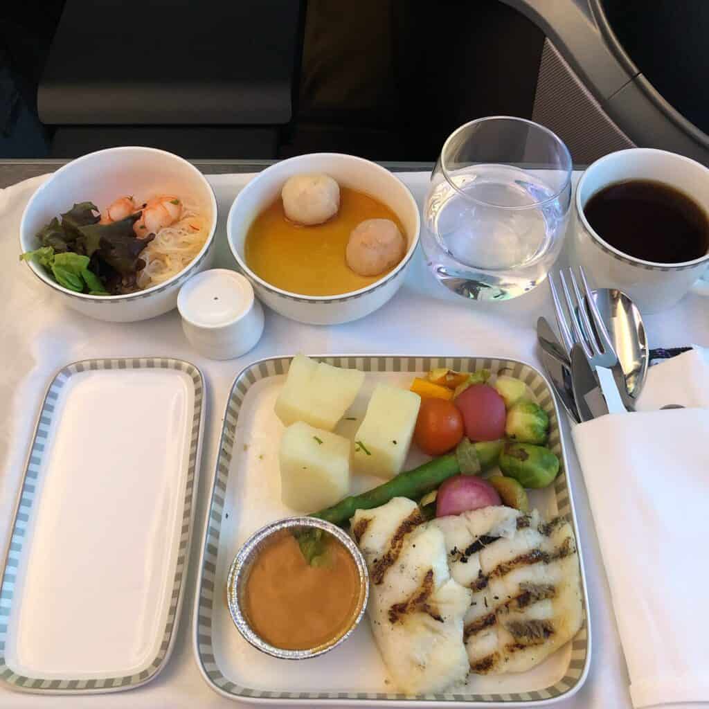 またバンコクからシンガポールへ向かう際はメイン料理が白身魚のバターソテーにトマトとモッツアレラチーズのサラダ、ココナッツ風味のケーキといった構成でした。