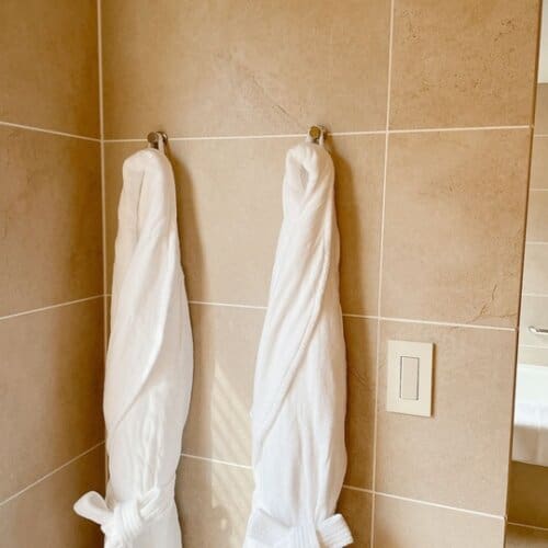 バスローブの用意も。写真を撮り忘れしまったのですが、右横がバスルームとなっています。