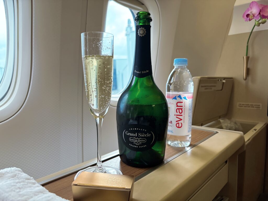 機内でいただけるワインなどもファーストクラスにふさわしいものが提供されており、シャンパンは1本2万円超のグラン シエクル ローラン・ペリエ。