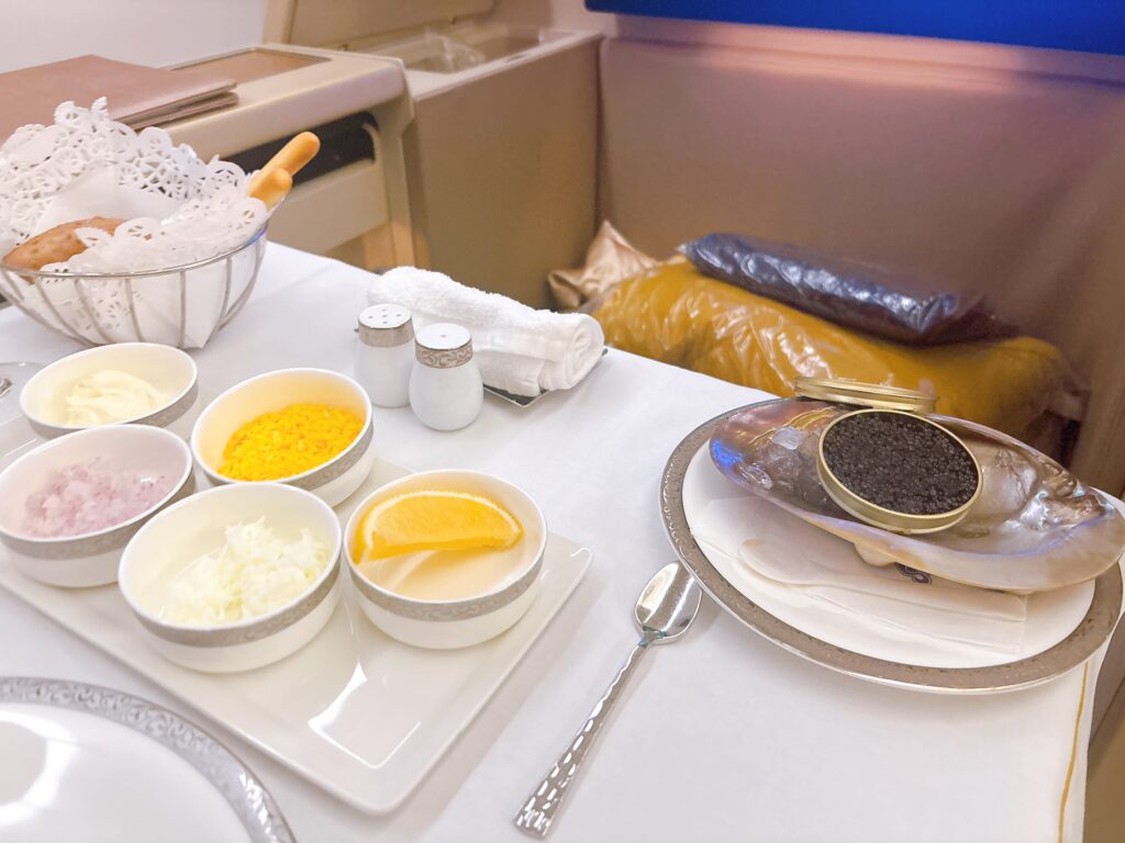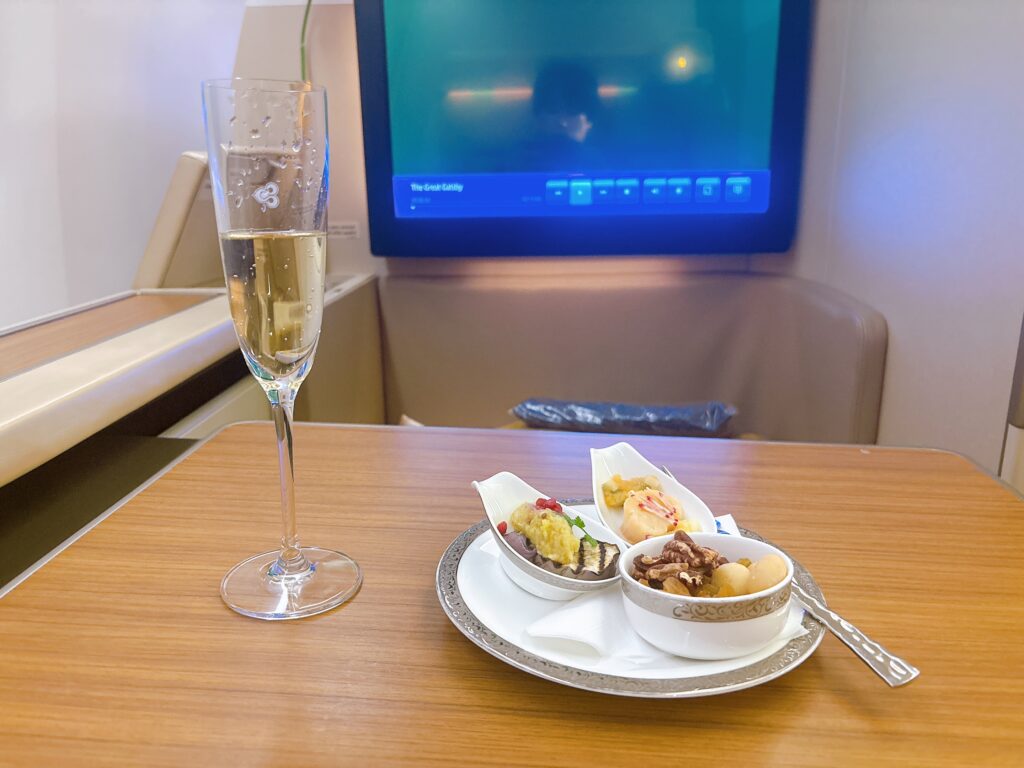 ファーストクラスではアピタイザー→キャビア→前菜→メイン料理→デザートといったフルコース料理を堪能できます。