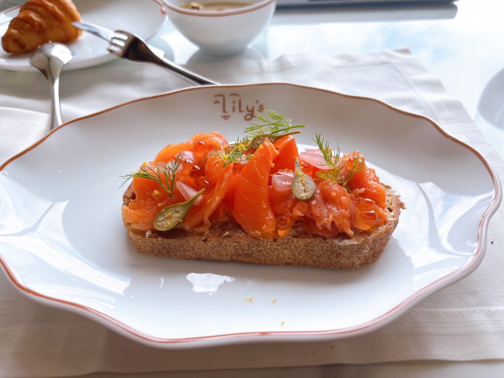 バターで焼かれたトーストの上にたっぷりのスモークサーモンといくらが乗った贅沢な一品です。