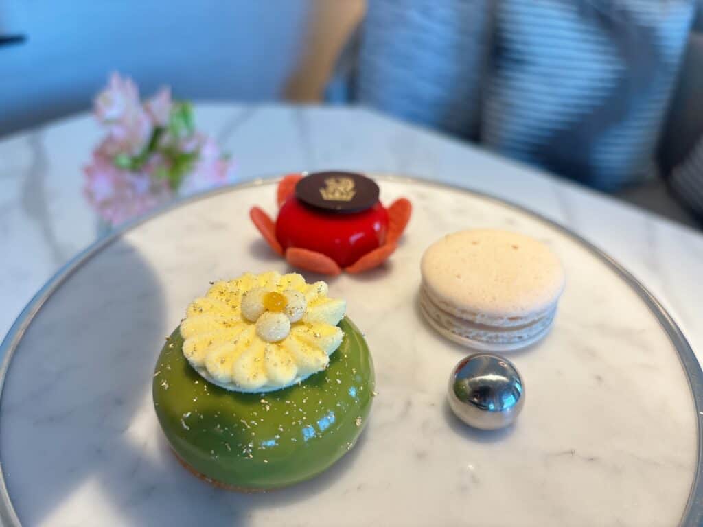 抹茶のムース、リッツカールトンロゴのチョコレートが乗っかったいちごのムース、マカロン。