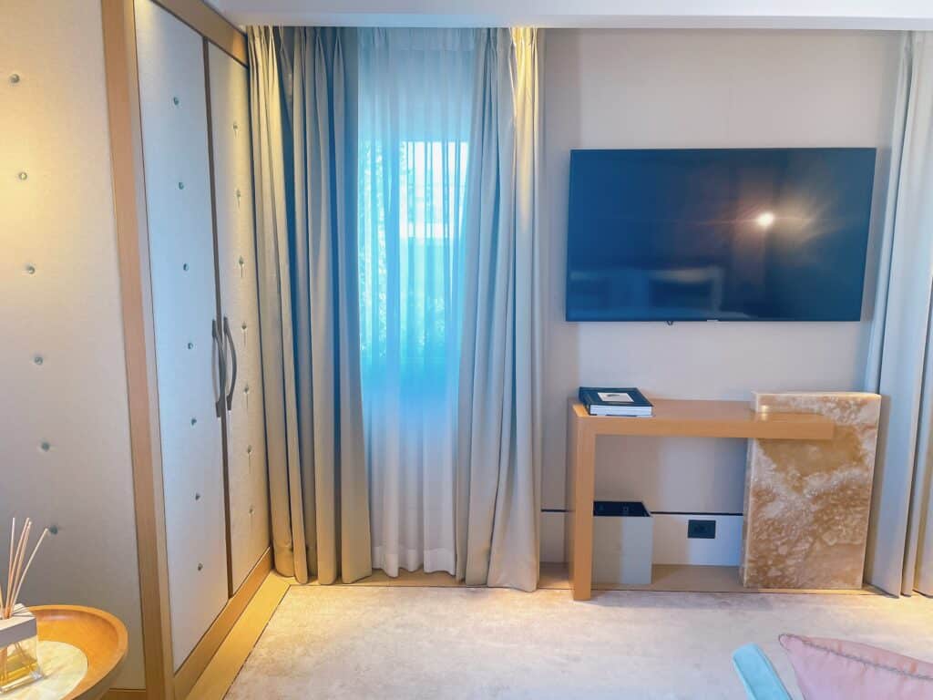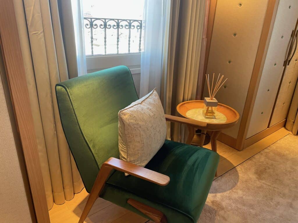 お部屋は王道のラグジュアリールームを想像していたのですが、ピンクアイボリー、グレー、グリーンを基調とした家具を中心にモダンラグジュアリーな空間が広がります。