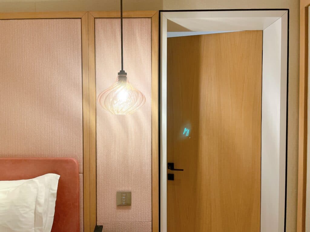 ベッドサイドにある、ヴェネチアンガラスで作られたランプがお部屋の雰囲気に良いアクセントを与えています。