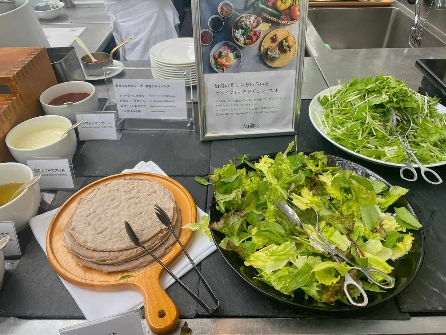サラダのお隣にはガレットも用意されていて、お好みのサラダや卵料理、ベーコンを包んでいただくことも可能です◎