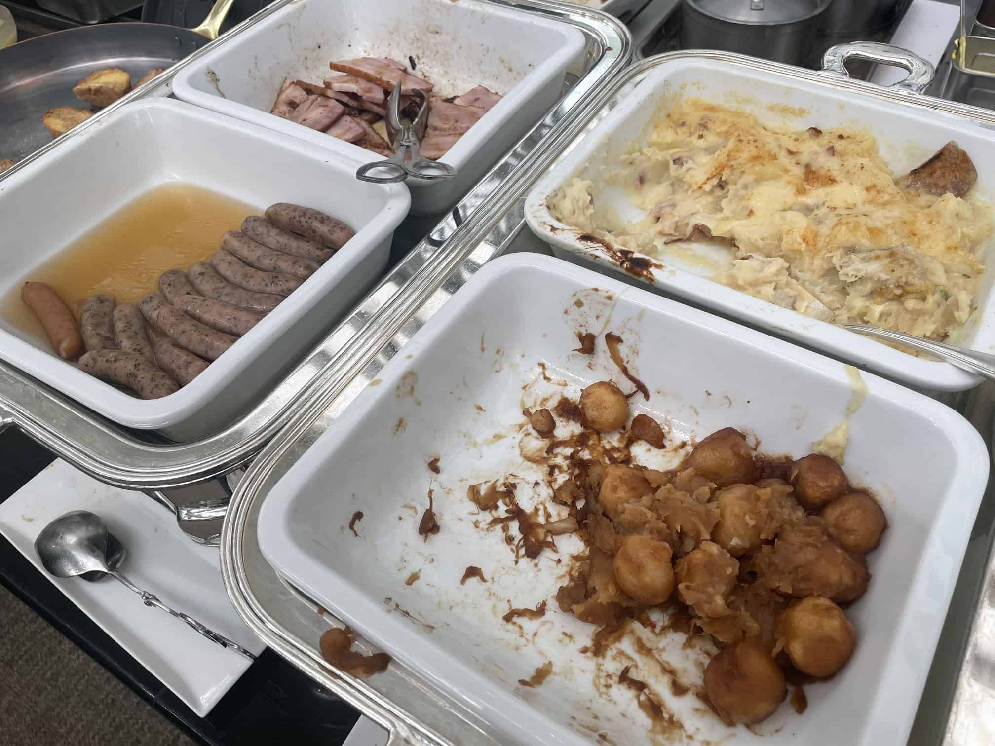 ホテル朝食の定番ソーセージ、ベーコン、ポテトグラタンなど。