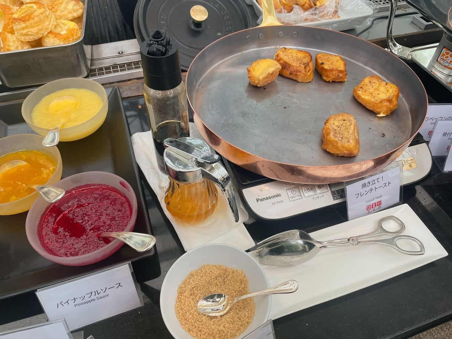 中央のキッチンカウンターでは、焼き立てのフレンチトーストも提供されています。