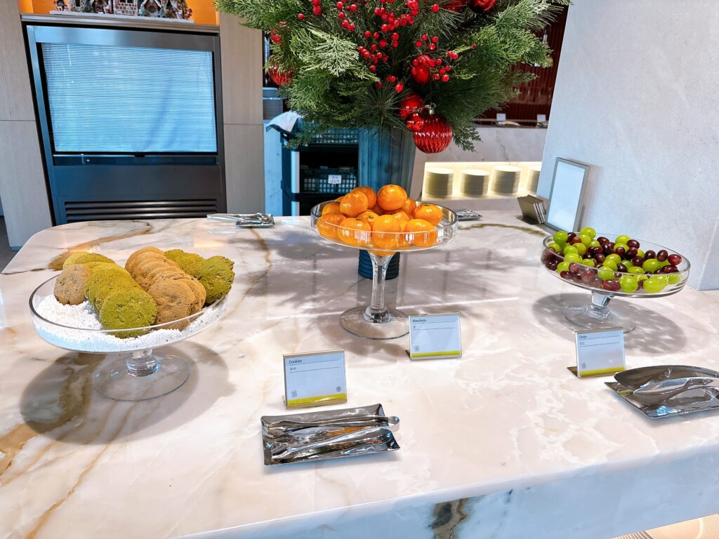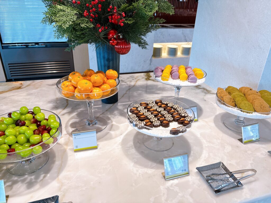 コーディアルタイムだけでなく、フードプレゼンテーションを行なっていない時間帯は上記のようなホームメイドクッキーとシャインマスカットなどが提供されていました。